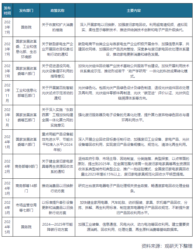 进一步积极响应国家政策规划,各省市对光伏组件回收行业的发展做出了具体规划,支持当地光伏组件回收行业稳定发展,比如山西省发布的《美丽山西建设规划纲要 (2023-2035年)》提出推动主要农业废弃物资源化利用,促进废弃电器电子产品规范回收处理,推行生活垃圾分类,加快推广全生物降解塑料等新型材料,提高塑料废弃物资源化利用水平。推进退役太阳能板的回收处理。
