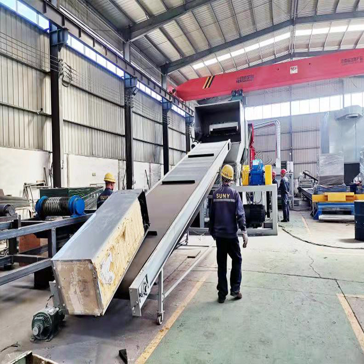 经细破碎之后的物料经带罩的输送带送振动分选床进行分选出保温棉粉尘、铁类、非铁类、塑料等。